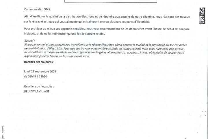 Coupure d’électricité lundi 23 septembre de 8h45 à 13h30 Cliquez sur l’image pour consulter la liste des zones concernées.