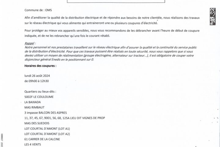 Coupure d’électricité lundi 26 août de 9h à 12h30 Cliquez sur l’image pour consulter la liste des zones concernées.